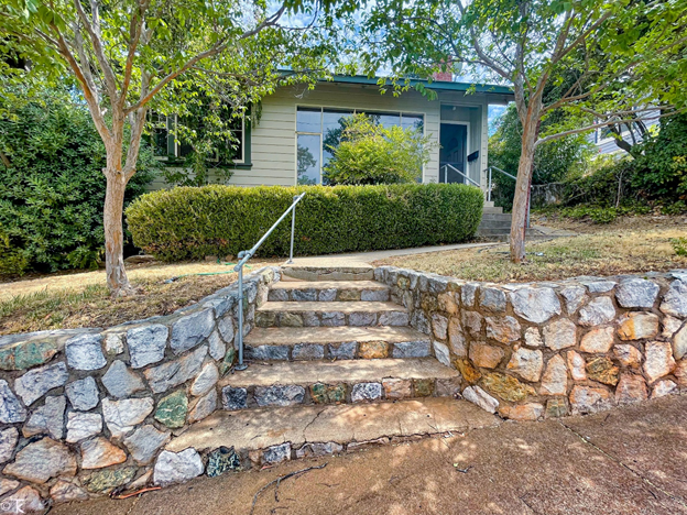 Built right to the edge of the street on a half-lot, in a time with fewer rules, Bertha’s house has the look of an afterthought with a permanent foundation undergirding it. Two-storied, box-like and utterly devoid of aesthetic considerations, form fell prey to function before the ink had dried on its construction blueprints. The idea of setback ordinances was unknown to the Tuolumne County officials of the time, so there was nothing to prevent someone from setting foundations literally as close to street-side as possible.
